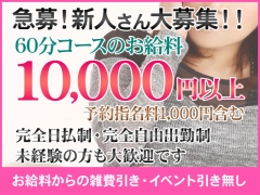 充実したお給料システムを実現しております。60分のお給料は10,000円以上(※指名料1,000円を含む)。別途オプション・移動交通費などが全額支給致します。もちろん、雑費引き・イベント引き・ノルマ罰金などは一切ございません。