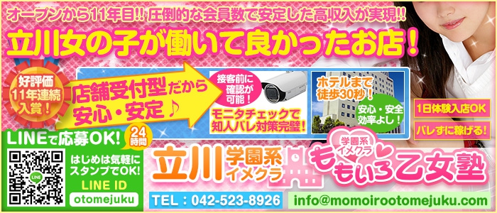 | 仕事内容 | 今!立川が熱い!?理由3ヶ条!! 1条 お客様も女の子も実は都心部よりも知り合いに会う確率が低いので、遊び易く働き易い! 2条 交通の便がいい!新宿、八王子、相模原から約20分!! 3条 当店の様な10年以上の老舗が少ない為、お客様が集中して安心感のある老舗に集まりやすい!!! ☆創業10年以上の実績の当店だからこその ☆ ☆★☆3つの安心ポイント☆★☆ ①直接の派遣では無く1度お店にお客様がご来店をし、受付後にご案内ですので、泥酔されてる方や清潔感のないお客様の入店を完全シャットアウト!! ②デリバリーヘルスと違い自宅でのお仕事は一切御座いません。ホテルのみのお仕事ですので清潔です!しかも利用ホテルはお店から徒歩30秒!! ③急に出勤をしたいや、逆にどうしても急に休まないとや早退しないとなどOKの完全自由だからこその「知人バレゼロ宣言」!! ☆2月16日入店の女の子の生の声☆ 初めてのお仕事で凄く不安でしたが、メールでのしつこいくらいの質問攻めに優しく親切に対応して頂いて安心できました(*^_^*)当日は面接で1つ1つ丁寧に説明をして頂きさらに安心できました。凄く不安症の私でも頑張って1日やってみようと思えました。 今では入店を決めてお仕事をして良かったと思っています。入店をしてからも優しく対応してくれて安心してお仕事出来てます(*^_^*)お客様も不慣れな私に優しく接して頂きました.面接前のイメージ(怖そうな)が一気に吹き飛びました!目標の金額まで頑張ってみようと思います♪ ☆★☆稼ぎたい気持ちはあるけれど、初めてなのでどうしても不安や心配が先立ってしまう。 今の職場では、あまり稼げない、または、待遇に不満がある。 そんな方は、まず当店ももいろ乙女塾にお問い合わせください! 初めての方も経験者も、安心してお仕事ができて居心地も良く(居心地が良過ぎて、卒業してしまった女の子も、まったりしに遊びにくるくらいです)、しかもかなり稼ぎやすいアットホームなお店です♪スタッフ一同が全力でサポート・フォローします!! 即日入居可能なワンルームマンション寮も御座います☆ 経験者の方は煩わしい講習一切無し!!面接から入店まで最短10分!! 未経験者の方は実技講習か口頭講習かを御希望に応じてお選び頂き、口頭講習の場合は最短30分で体験入店できちゃいます |